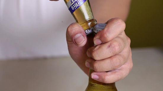 The first party goer handed him his bottle, then the second party goer held his bottle upside down  and placed the edge of its bottlecap against the other bottlecap.  “A little trick I learned at Beta Delta, using one bottle to open another.”