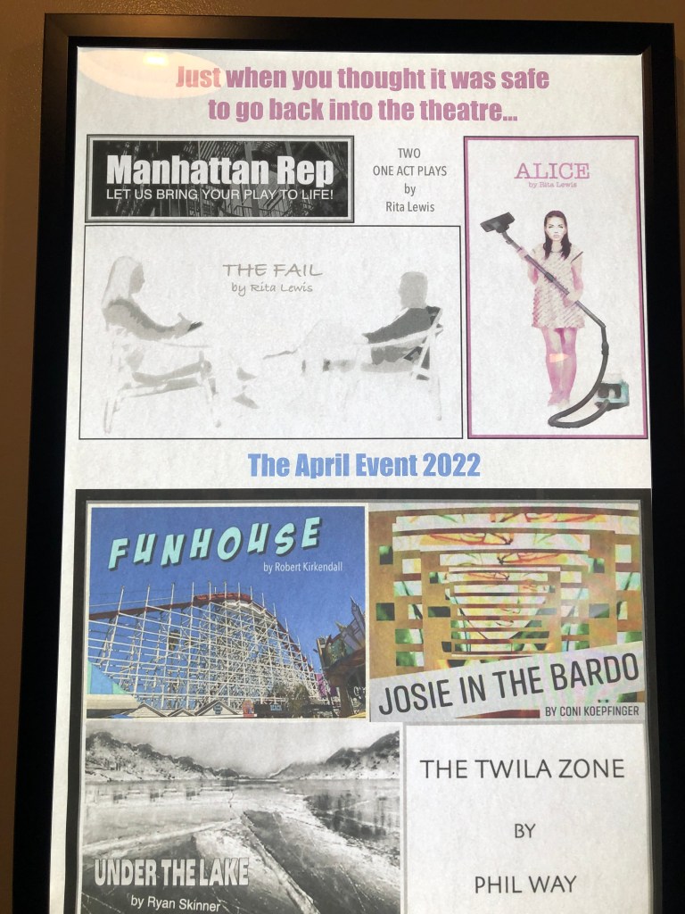 I was happy to see that most of the seats were full and I sat in one of the few empty ones at the front right corner. Once it was 3:00 I turned off my phone and waited in the buzz that permeates a theater just before actors take the stage. Then the house lights went out and the first two actors came out for the first play Under the Lake, a story about a man trying to spear something under a lake and his daughter trying to calm him down, very poignant. Next play was The Twila Zone, a comedy about a first date that quickly goes off the rails, witty as well as physically funny. Third play was Josie In the Bardo, a story of a lounge singer who after a near death experience finds herself in a purgatory with her older self, deep and otherworldly. Below is a link to digital program that lists all the actors and playwrights.