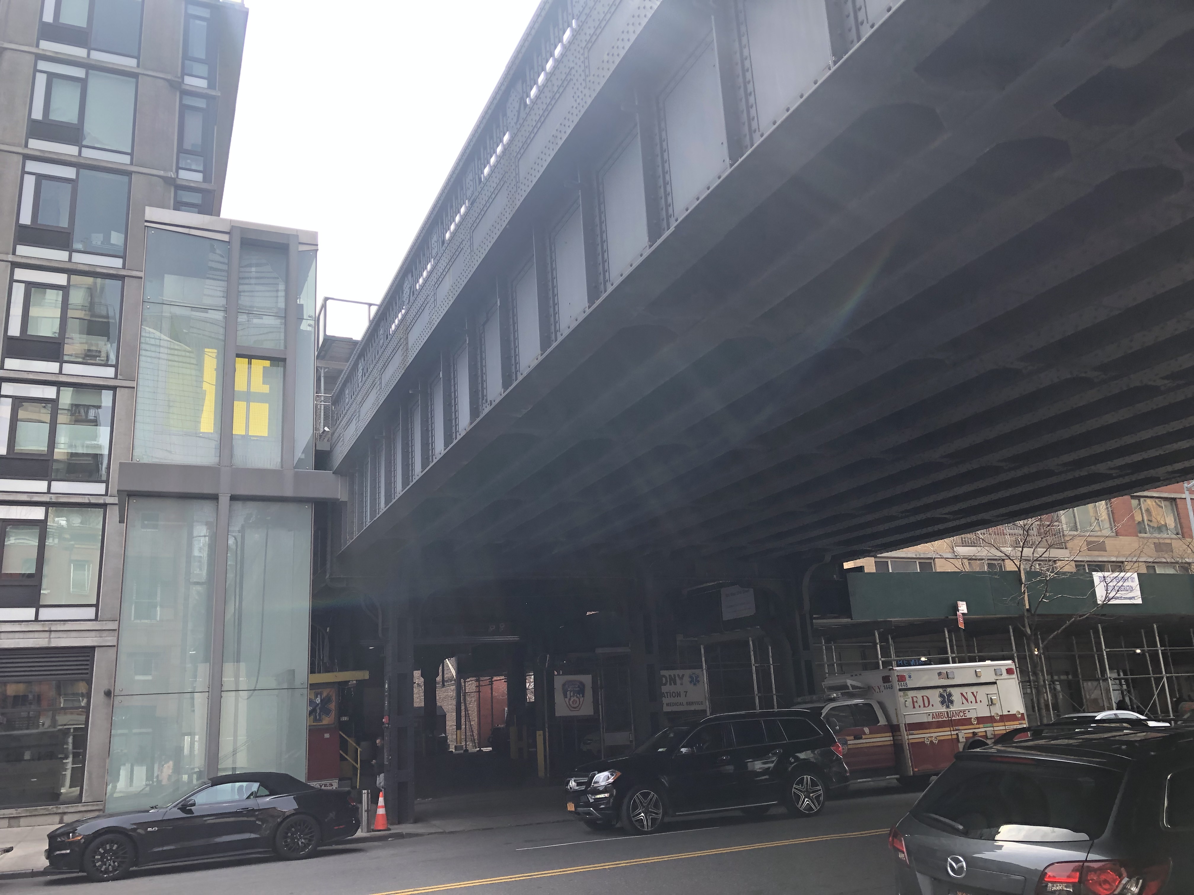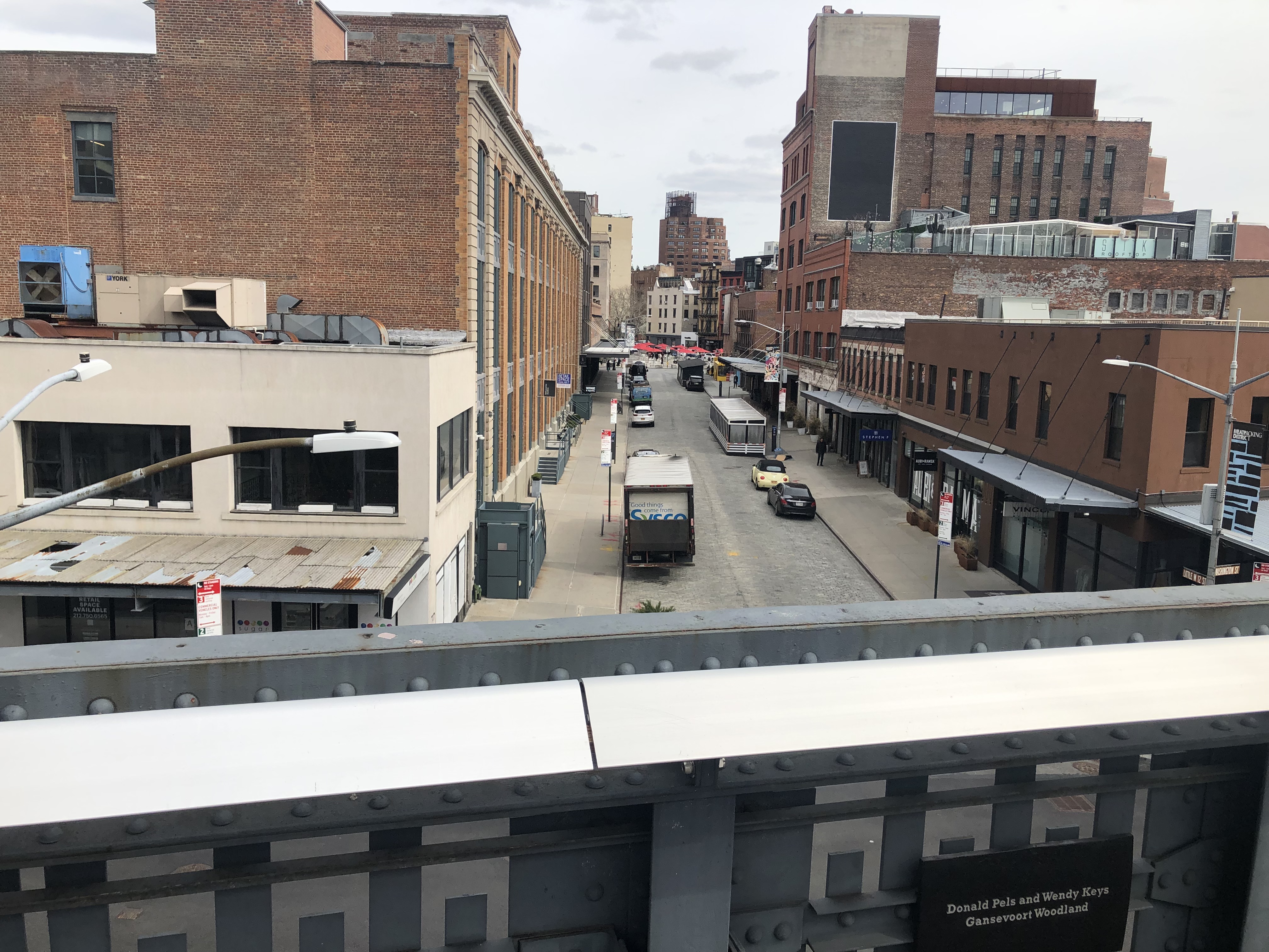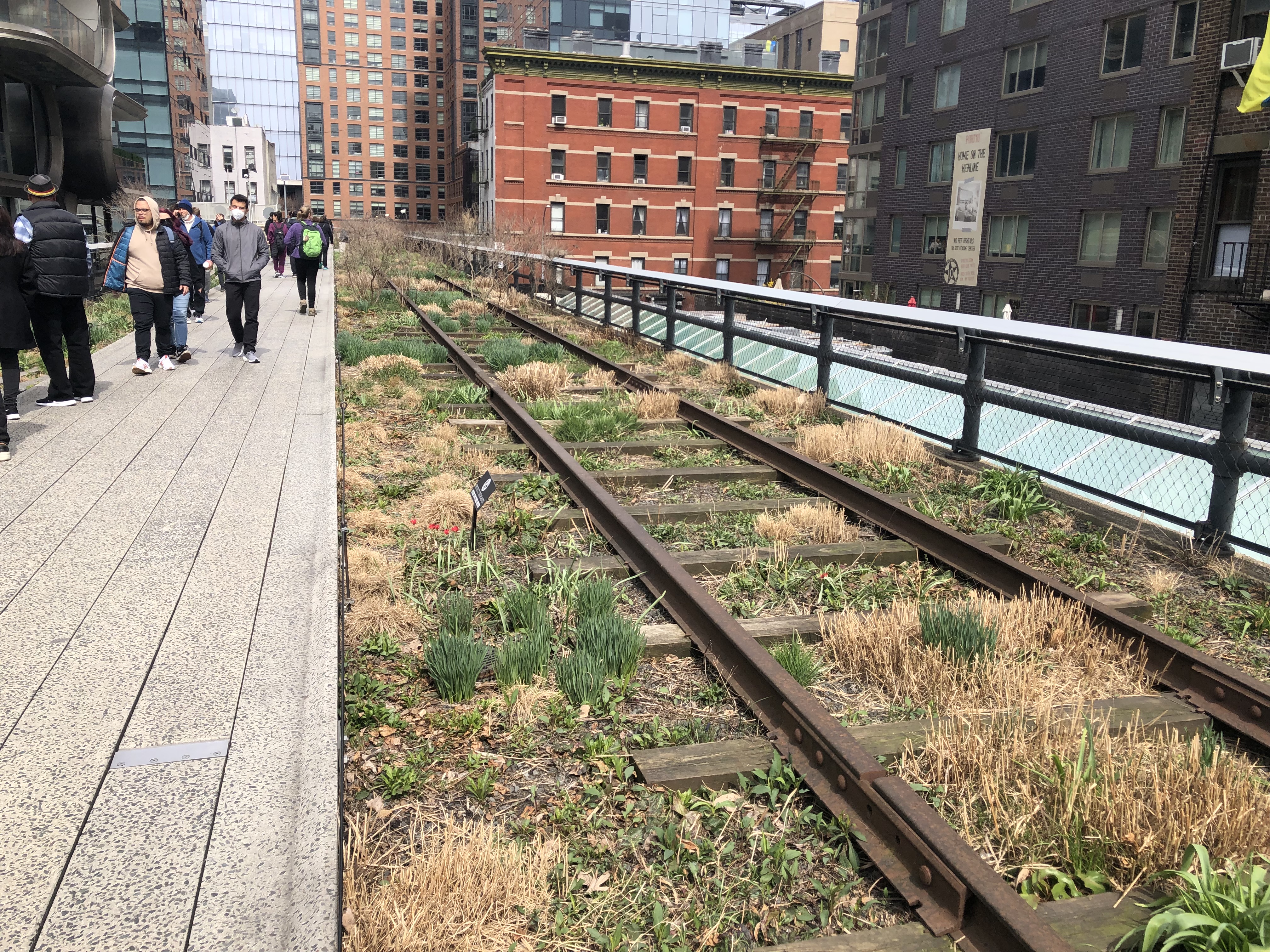 The High Line is a former New York Railroad spur line that fell out of use by 1980 and was partially demolished to make room for construction. What was left of the elevated railway was converted into a public park and runs about 1.5 miles/2.3 km along 10th Ave from 34th St down to Gansevoort Square.
