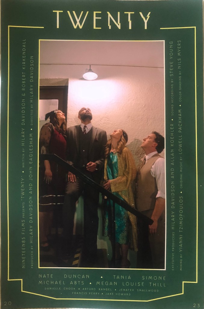 TWENTY is about four friends are on the way to a roaring ’20s party when they glitch into an alternate universe that has a prohibition on privacy. They end up at a modern speakeasy and are having a good time until they discover a corrupt bootlegging scheme and one of them blackmailed. More information about TWENTY can be found on the Nineteen 85 Films site. https://nineteen85films.com/