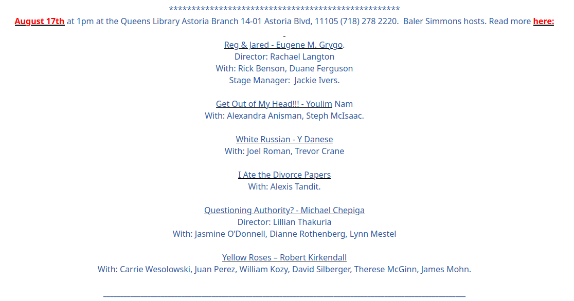 My one act drama Yellow Roses will be part of an afternoon of staged readings by Equity Library Theater at the Queens Public Library and presented by The Woodside Players. Event begins at 1PM and there will be six short plays. My play takes place in a neighborhood pub on a Tuesday night and has six characters and three separate story lines that tie together in the end. Address of Queens Public Library is 14-01 Astoria Blvd, Astoria Queens, 11102. Got six quality actors and a skilled director putting this together and I’m going to make the trip from California to be there! More information below.