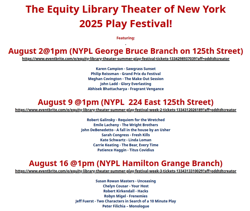 My 10 minute comedy Hacks will be performed at Equity Library Theater‘s Hamilton Grange Branch venue at 503 W. 145th St. in New York’s Upper West Side on August 16 at 1PM. Four other short plays and monologue will also be performed at the show.
